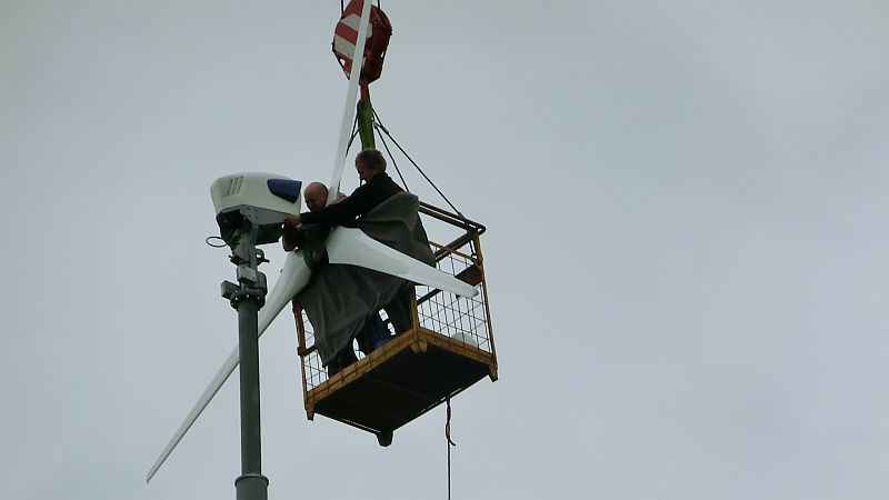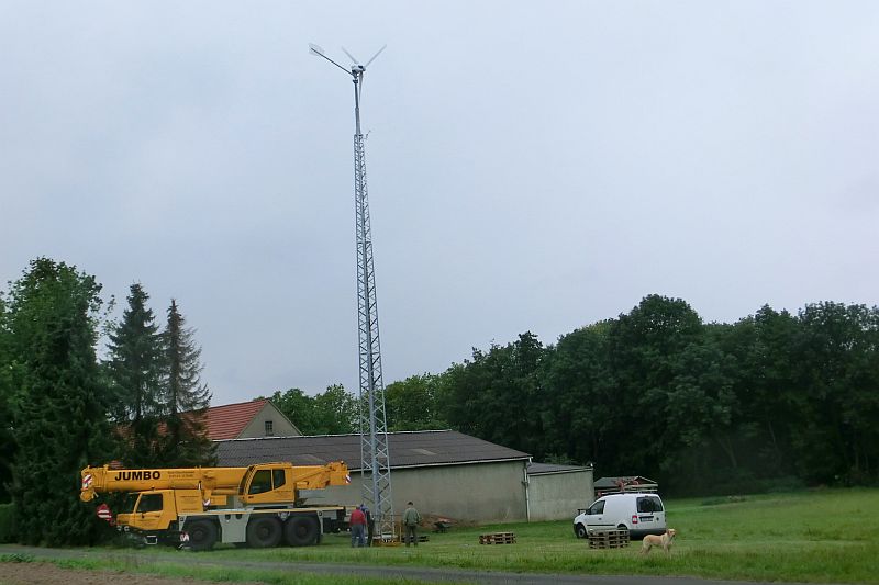 Nach dem Aufrichten werden oben die Rotorblätter montiert und die Anlage in Betrieb genommen.