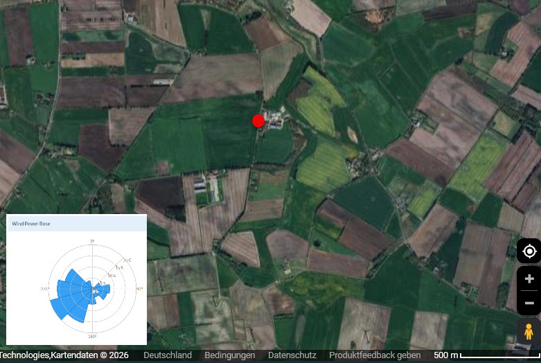 In der folgenden Abbildung erkennt man den Standort der Windanlage anhand des roten Punkts. Integriert ist die energiespezifische Windrose (Wind Power Rose), welche zeigt, dass Hauptwind Südwest ist. Der starke Wind kommt übers Jahr aus südwestlicher und westlicher Richtung. Dort sind ausgehend vom Standort der Anlage in 400 m Entfernung nur Felder zu sehen. Der Wind wird nicht durch Hindernisse gebremst.